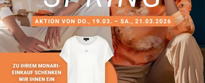 HELLO SPRING! Jetzt ist die perfekte Zeit für dein modisches Update. Unsere neue Kollektion strahlt mit der Sonne um die Wette und begeistert mit inspirierenden Trend-Pieces und frischen Farben. Feiere mit uns den Start in die Saison! Zu deinem Monari-Einkauf schenken wir dir ein exklusives Shirt mit edlen Schmuck-Details* *Ab einem monari-Einkaufswert von 119,99 €.
